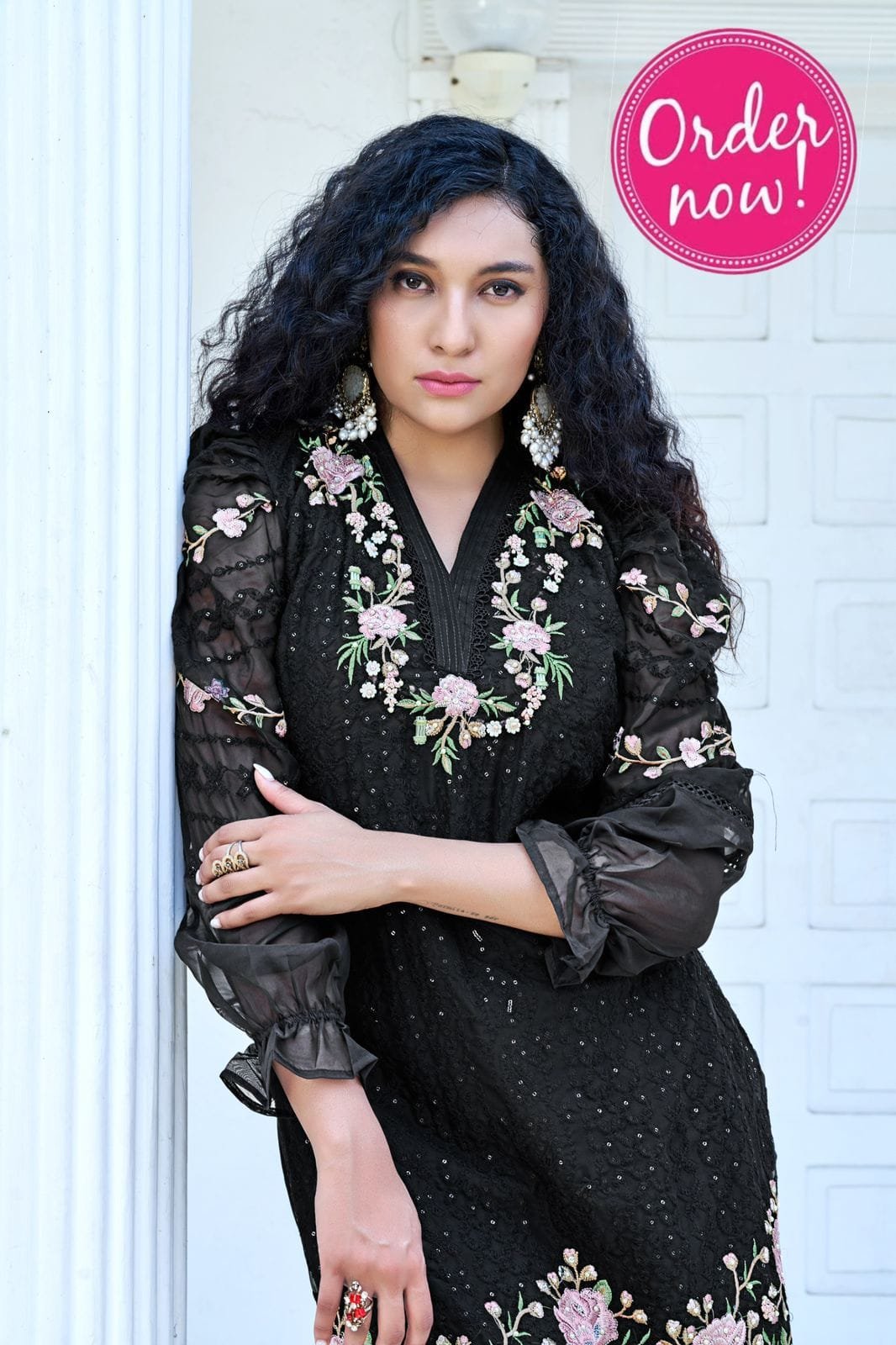 Designer stylish Heavy Embroidered Tunic Enhance With Embroidery & Handmade With Stylish Neck Pattern &Full Embroidered Sleeve With Beautiful Touch up Handwork with Glamours Gorgeous Looking In Baloon Sleeves Paired With Heavy Stretchable Bottom.