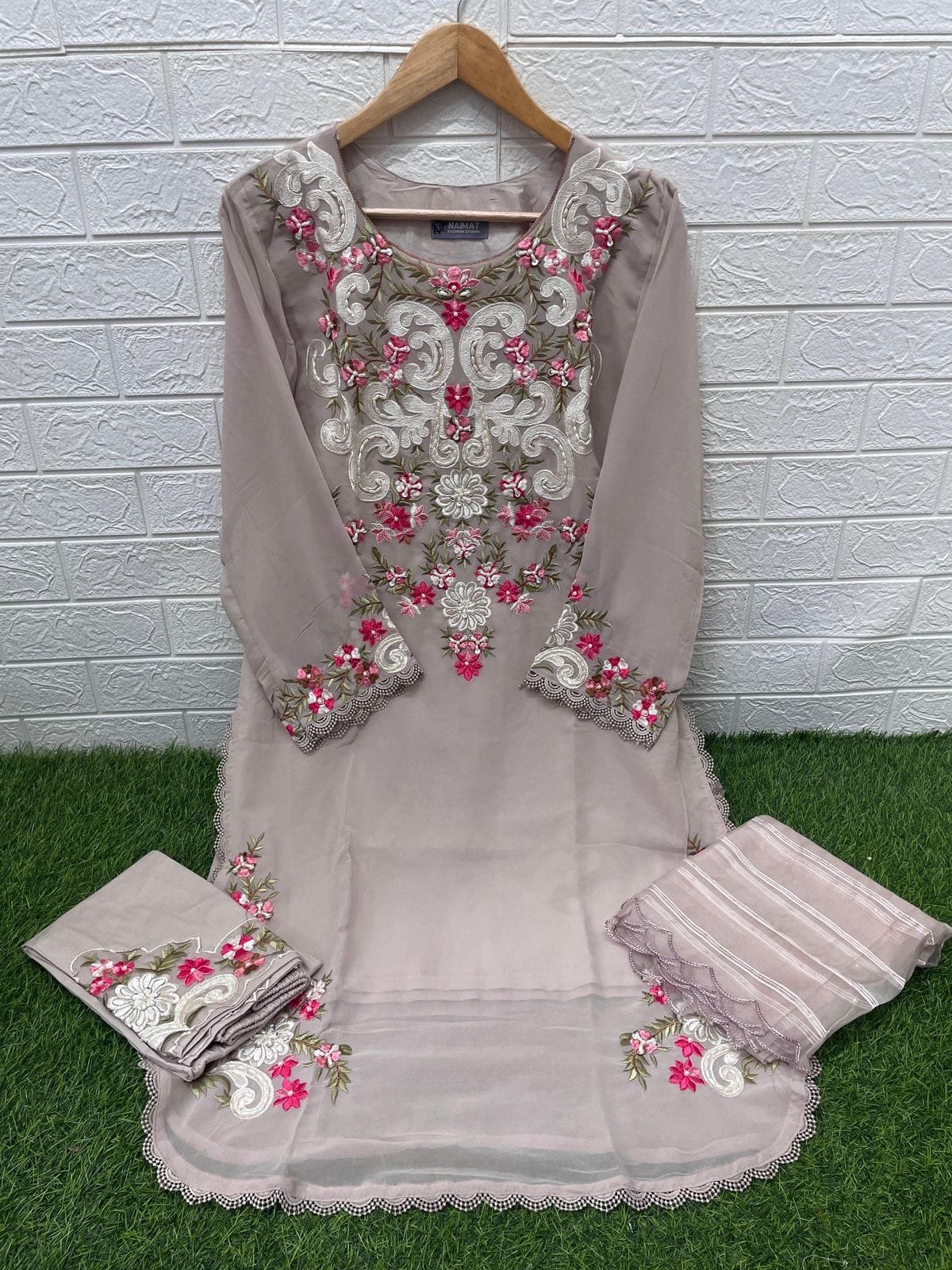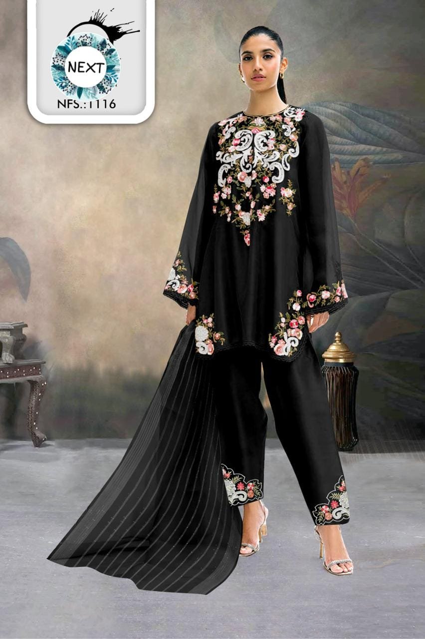 Designer Luxury Tunic with beautiful classy Embroidery With Hand Work in Top and Slive and with Fancy Orgenza Dupatta & Cigarette Stachable pant With embroidery patch